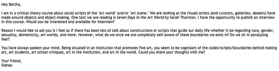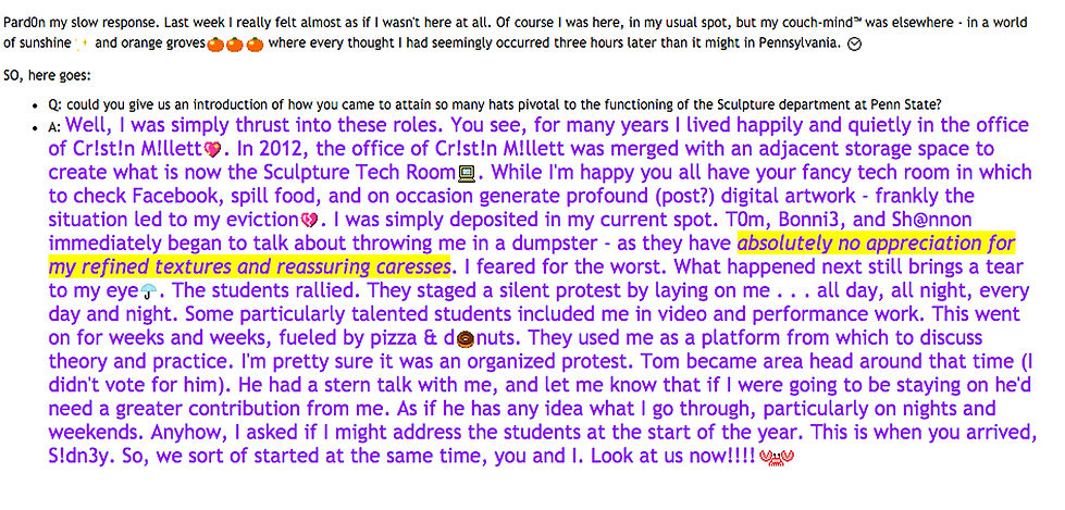 Bertha the Skanky Couch was the name of a couch that was a fixture of my MFA program at Penn State University. Many students sat on her between classes. She often appeared in student work. She was the perfect sleeping spot for all-nighters. One day, us students received an e-mail from Bertha. She relayed announcements and important dates making us aware of clogged sinks, university deadlines, and final critique dates. Not only was she helpful, she had flair to her writing style, and sass. As her e-mails came more frequently to my inbox, I decided to e-mail back to see what she would say (and try to figure out who Bertha was).